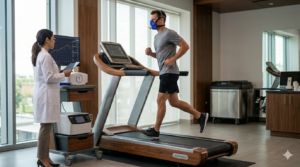 Clinical VO2 max testing uses a metabolic cart: a graded exercise protocol (typically on a treadmill or cycle ergometer) with direct measurement of inspired and expired gases through a mask you wear. During the test, you may also have electrodes attached to your chest to monitor heart activity, ensuring accurate data for interpreting cardiovascular fitness and metabolic efficiency. The test begins with walking at a moderate intensity and gradually increases in intensity until you reach your maximum effort. This process measures actual oxygen consumption at maximal exertion with an accuracy of plus or minus 2 to 3 percent. This is not an estimate. It is a direct measurement of your body’s peak oxygen processing capacity, providing valuable insights into your cardiovascular health and fitness level that wearables cannot match.